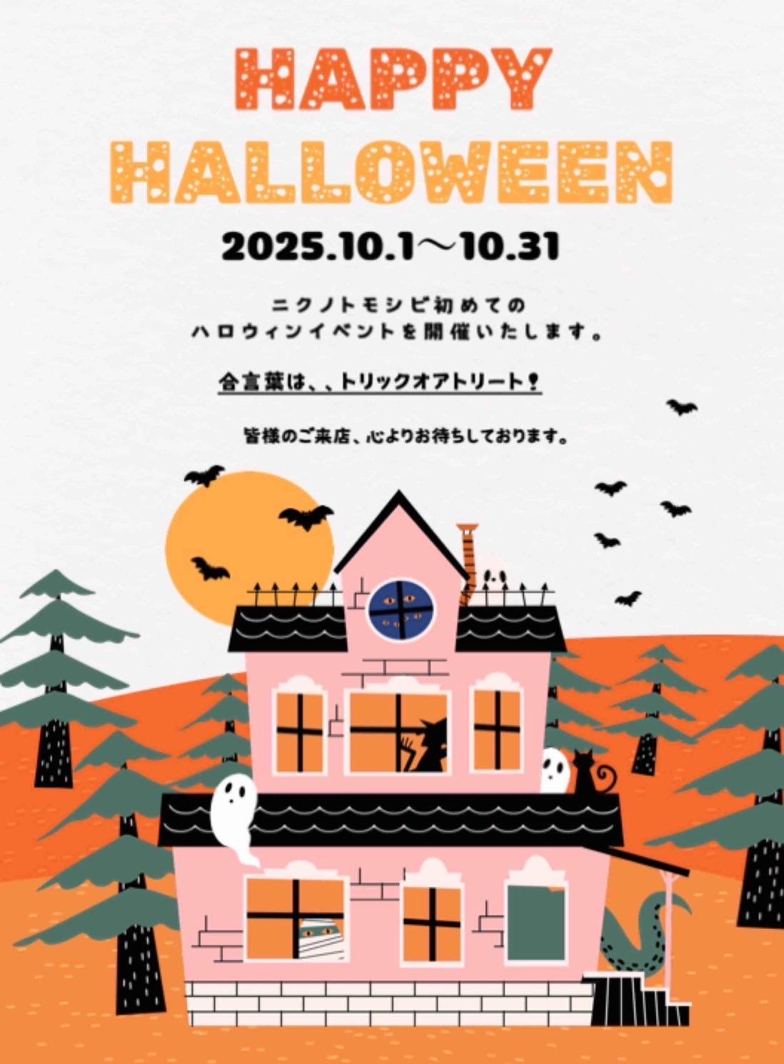 ご来店時にスタッフへ合言葉「トリックオアトリート!」とお伝えください。ハロウィンくじ引きにご参加いただけます。