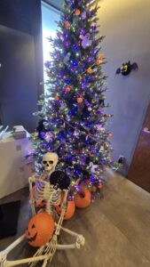 ハロウィン装飾の前で、家族全員での記念写真。仮装ウィーク中なら、スタッフとの集合写真も忘れずに!